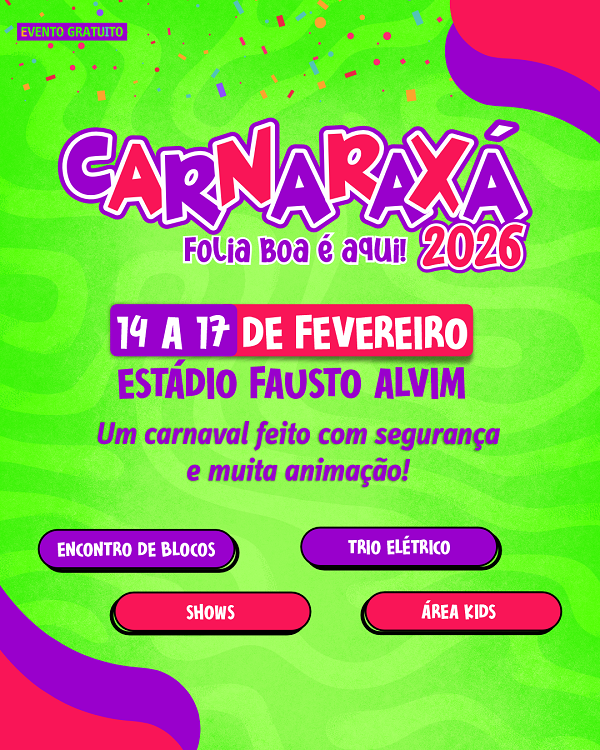 A programação do CarnAraxá 2026 contará com quatro dias de festa, entre 14 e 17 de fevereiro, com desfile de blocos carnavalescos acompanhados por trio elétrico, em cortejo diário da Praça Dom Bosco até o Estádio Municipal Fausto Alvim. No estádio, o público poderá aproveitar dois shows por noite, totalizando a apresentação de seis bandas araxaenses e mais duas atrações de fora. Também haverá brinquedos para crianças, praça de alimentação e reforço na segurança, criando um ambiente preparado para receber famílias e foliões de todas as idades.