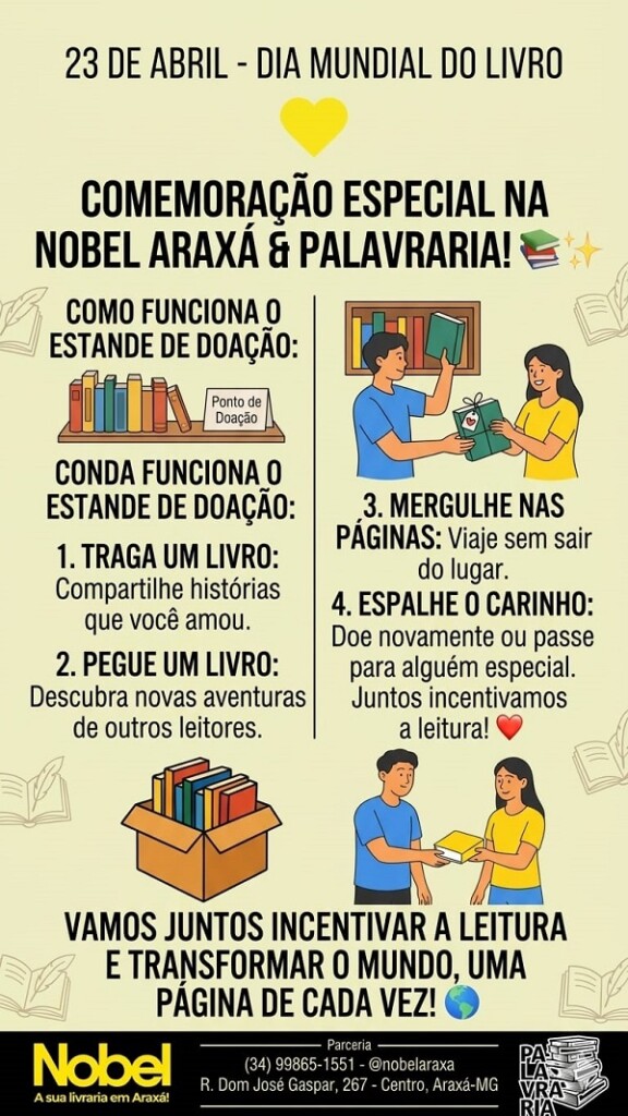No próximo dia 23 de abril, em celebração ao Dia Mundial do Livro, a livraria Nobel Araxá e o Projeto Palavraria unem forças em uma ação especial voltada para o incentivo à leitura. Através de um estande de doação montado em frente à livraria, a iniciativa convida a população a compartilhar histórias e descobrir novas aventuras literárias.
