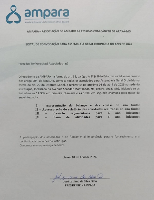 A Associação de Amparo às Pessoas com Câncer de Araxá (AMPARA) realiza na próxima quarta-feira, dia 8 de abril, Assembleia Geral Ordinária, um momento crucial para a definição dos rumos da instituição e o fortalecimento do apoio oferecido aos pacientes oncológicos da cidade. O encontro acontece em sua sede, localizada na Av. Senador Montandon, 98 – Centro, com início previsto para as 17h30 na primeira chamada e às 18h na segunda.
