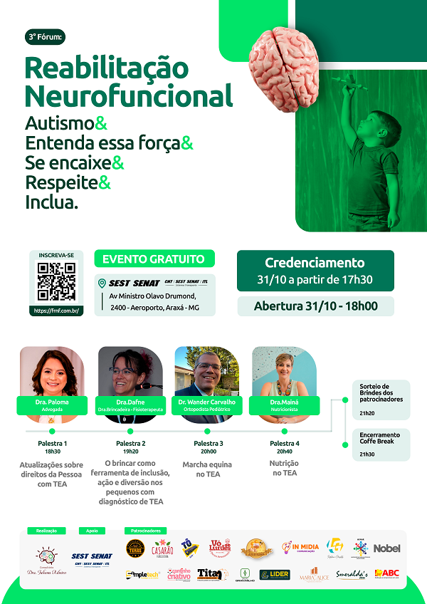 Araxá sedia na próxima sexta-feira, dia 31 de outubro, 3º Fórum de Reabilitação Neurofuncional de Araxá, promovido pelo consultório da Dra. Juliana Ribeiro. O evento focado no tema “Autismo: entenda essa força, se encaixe, respeite e inclua” será realizado nesta sexta-feira (31), na Unidade do Sest Senat.