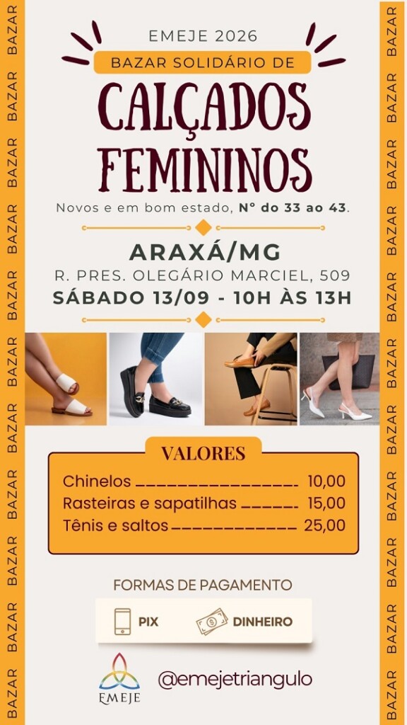 Serão vendidos calçados femininos em ótimo estado, com numeração de 33 a 43, a preços acessíveis: chinelos por R$ 10,00, rasteiras e sapatilhas por R$ 15,00, e tênis e saltos por R$ 25,00. Toda a renda obtida será destinada à organização do EMEJE 2026, que ocorre durante o período de carnaval.