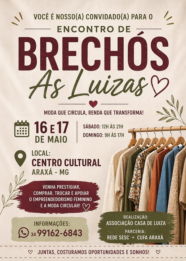 Como parte das ações do projeto, será realizado o Encontro de Bazares e Brechós – As Luizas, nos dias 16 e 17, no Centro Cultural de Araxá, reunindo bazares, brechós e empreendedoras locais em um espaço de comercialização, troca e valorização da moda circular.
