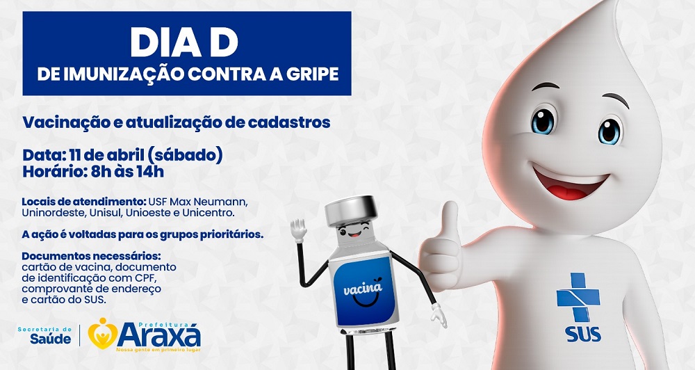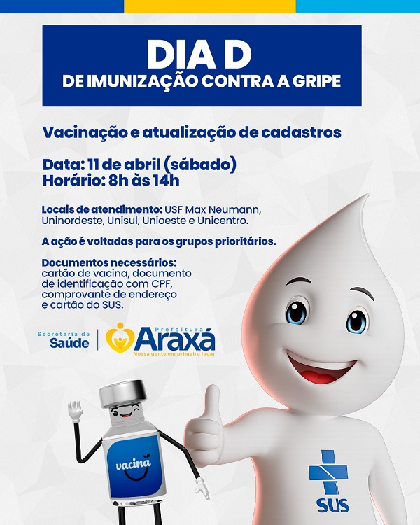 A Secretaria Municipal de Saúde de Araxá realiza no próximo sábado, 11 de abril, o Dia D de imunização contra a gripe, com atendimento das 8h às 14h nas unidades Uninordeste, Unisul, Unioeste, Unicentro e USF Max Neumann.