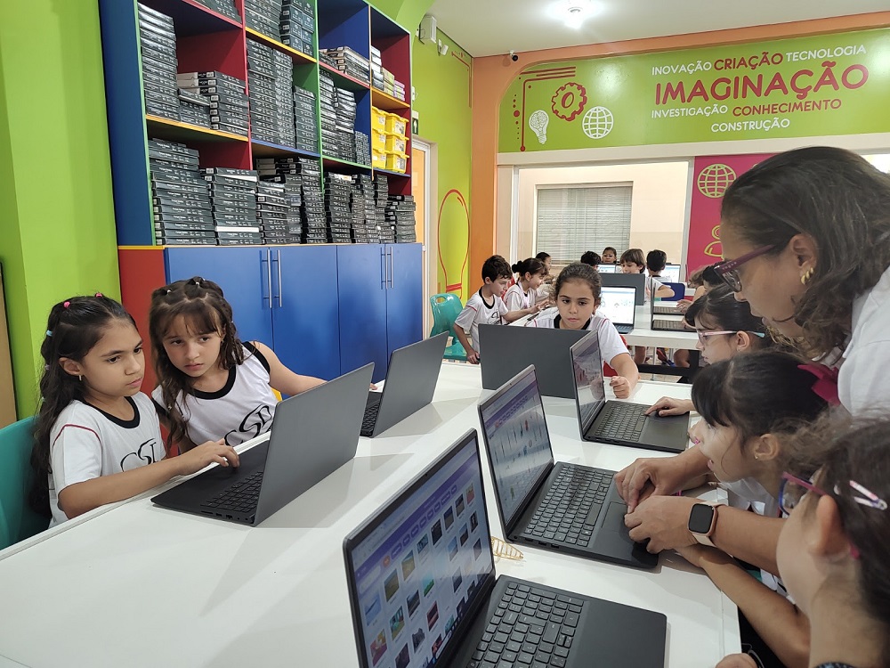 Conceitos como sequências estruturadas, loops, variáveis e eventos passam a fazer parte do repertório dos alunos, culminando, no 5º Ano, na elaboração de projetos autorais apresentados na Mostra Maker.