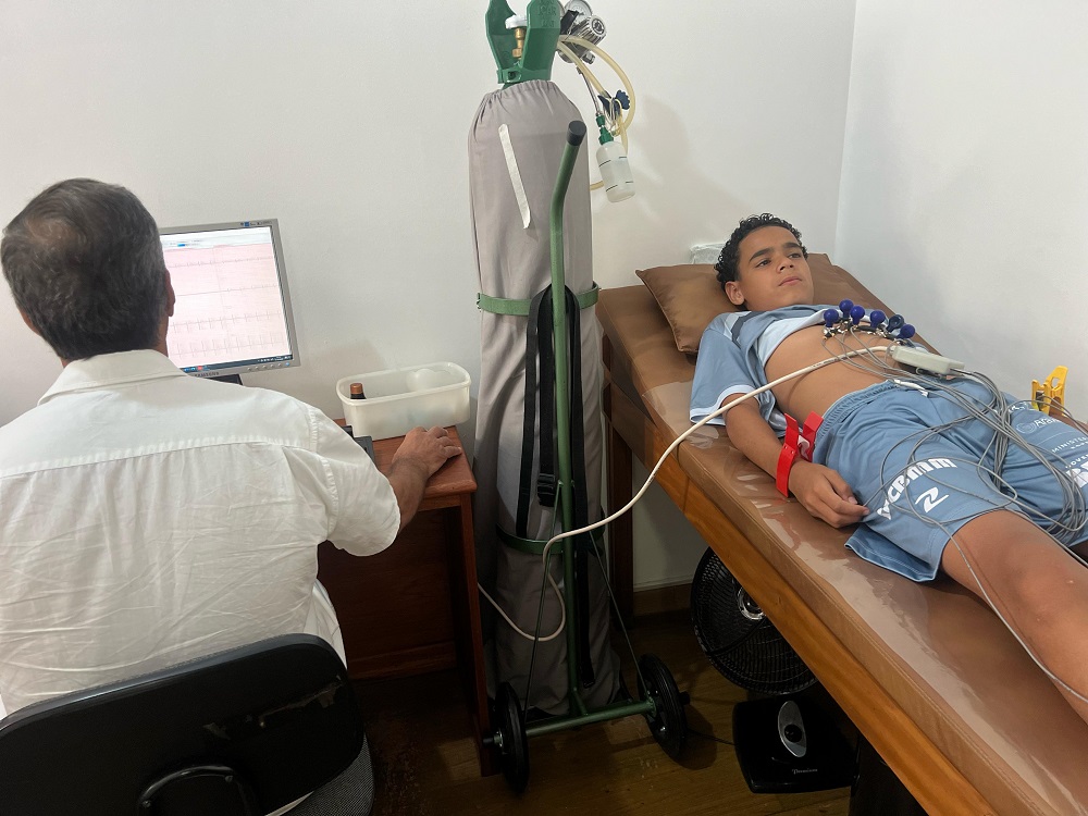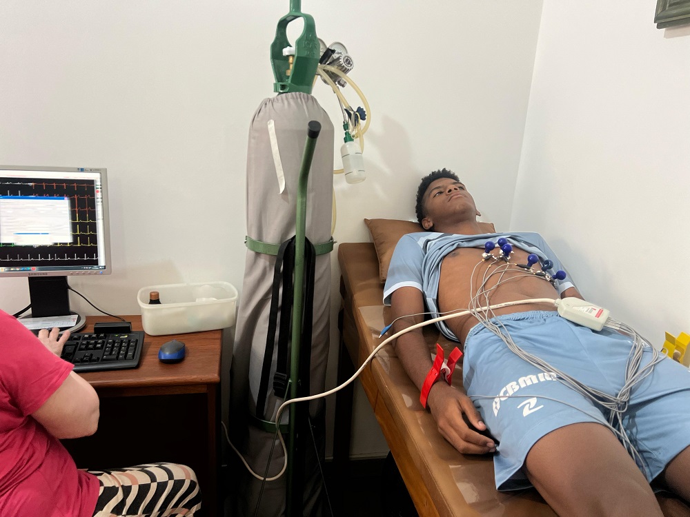 O exame, conhecido como eletrocardiograma (ECG), é uma ferramenta fundamental para analisar a saúde do coração dos atletas, auxiliando no diagnóstico e monitoramento de possíveis doenças cardíacas.