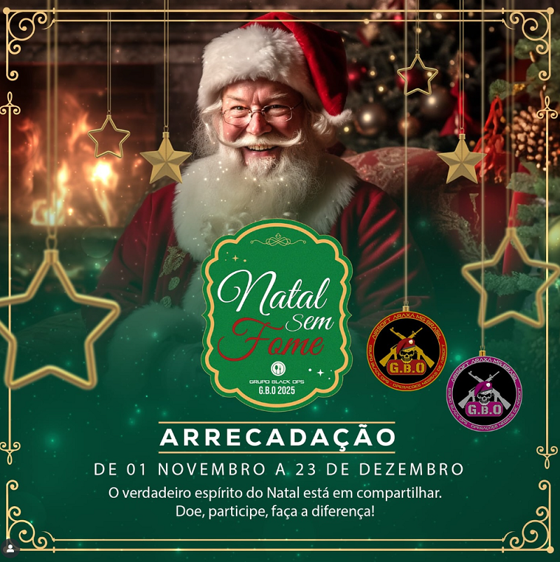 O Grupo Black Ops (GBO) de Araxá deu início à sua tradicional campanha social “Natal Sem Fome GBO”, com o objetivo de arrecadar alimentos não perecíveis e cestas básicas para famílias em situação de vulnerabilidade na cidade neste fim de ano.