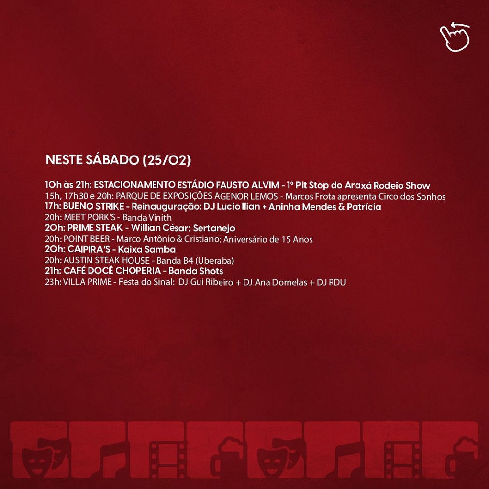 O final de semana chegou e com ele a agitação rola solta em Araxá. Confira a programação para o final de semana na Agenda Cultural do Jornal Araxá. Aqui, você fica sempre bem informado…