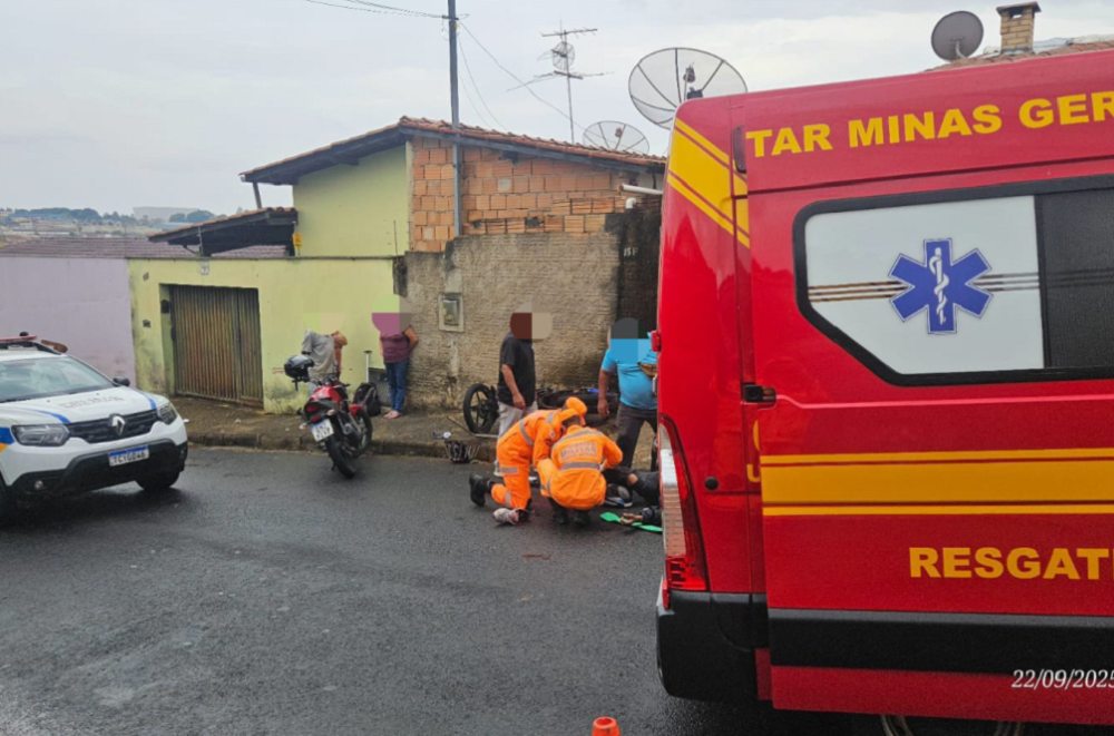 A colisão envolveu uma motocicleta e um automóvel. No local, os bombeiros encontraram o condutor da moto, de 59 anos, com uma fratura aberta na perna esquerda. A vítima estava consciente e orientada durante todo o atendimento.