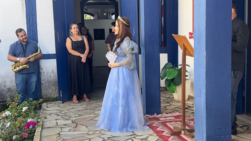Durante a solenidade, o público acompanhou um dos momentos mais marcantes da cerimônia: a entrada da descendente da sétima geração de Dona Beja, Manoela Jacob, que desceu a escadaria do museu vestindo simbolicamente o traje.