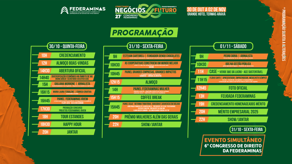 Quatro painéis reforçam a diversidade da programação. O Painel Grandes Empresas, Grandes Impactos traz Carlito Arruda, CEO da Arruda Alimentos; Rosane Santos, diretora de sustentabilidade da Samarco e Fernando Passalio, presidente da Copasa. O Painel Federaminas Mulher, vem com Daniela Grellin, diretora executiva do Pacto Global e Adriana Muls, diretora do Diário do Comércio. Já o Painel Federaminas Jovem tem como convidado Felipe Cota, CEO da Zero Carbon. O painel CEAJE discute reforma tributária com João Paulo Fanucchi de Almeida Melo, presidente do CEAJE-Federaminas; Gustavo Chalfun, presidente da OAB-MH e Flávio Boson Gambogi, desembargador federal do TRF.