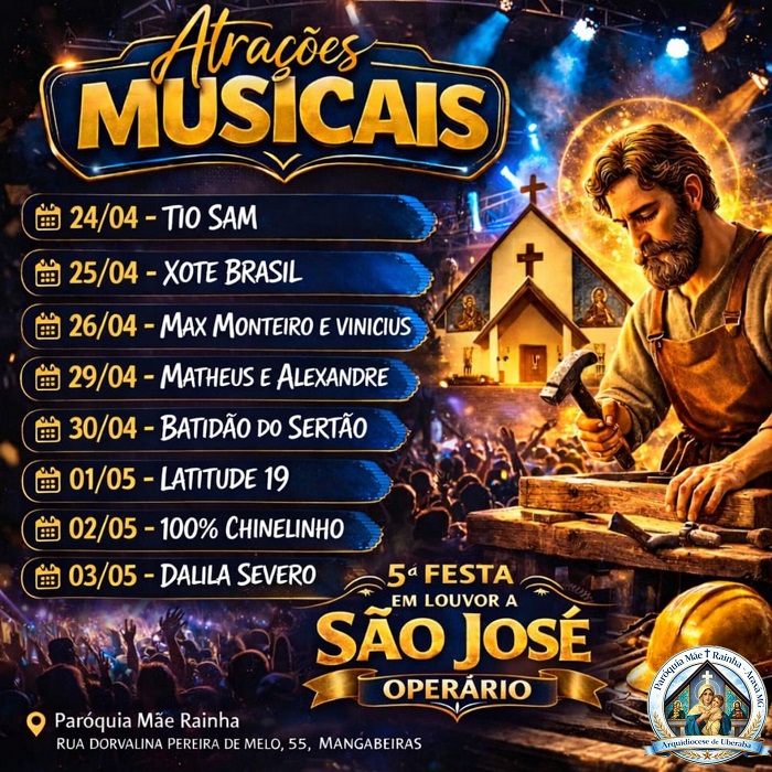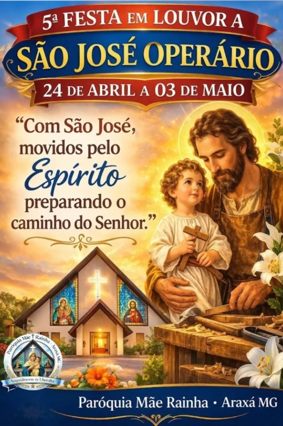A Paróquia Mãe Rainha de Araxá, se prepara para uma celebração especial em honra a São José Operário, que acontecerá de 24 de abril a 03 de maio. A festa promete reunir a comunidade em um momento de fé, alegria e confraternização, com uma programação repleta de atividades religiosas e culturais.