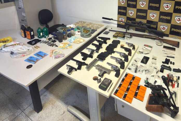Entre as armas apreendidas, estavam pistolas calibres .22, .40, 9mm, .45 e .380, além de uma submetralhadora de fabricação caseira, uma espingarda calibre 12, um rifle calibre .22 e revólveres calibre .38.