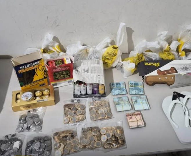 Ao chegarem ao local, os policiais realizaram uma vistoria no perímetro e localizaram o homem saindo por uma abertura forçada em uma placa metálica, situada em uma construção anexa ao supermercado. O homem utilizava uma blusa verde e preta para cobrir o rosto e já carregava uma sacola com diversos produtos e moedas. Durante a busca pessoal, os militares encontraram R$ 6.292,00 em notas diversas escondidas nos bolsos do autor.