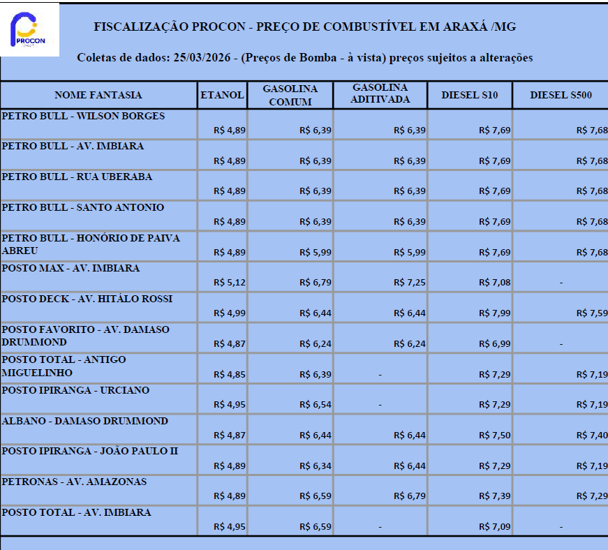 O Procon Araxá está intensificando as ações de fiscalização sobre os preços dos combustíveis na cidade e notificou os postos para apresentarem documentos que comprovem e justifiquem os valores praticados. A medida inclui o envio, no prazo de 10 dias, das notas fiscais de aquisição dos últimos 90 dias de gasolina, etanol e diesel. Paralelamente às fiscalizações, o órgão divulgou, nesta quarta-feira (25), a mais recente pesquisa de preços dos combustíveis no município.