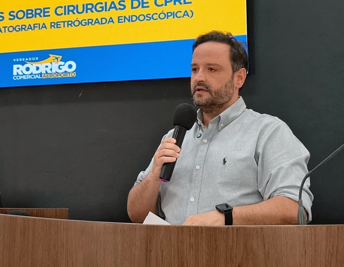 O vereador Rodrigo do Comercial Aeroporto durante uso da tribuna na Câmara de Araxá