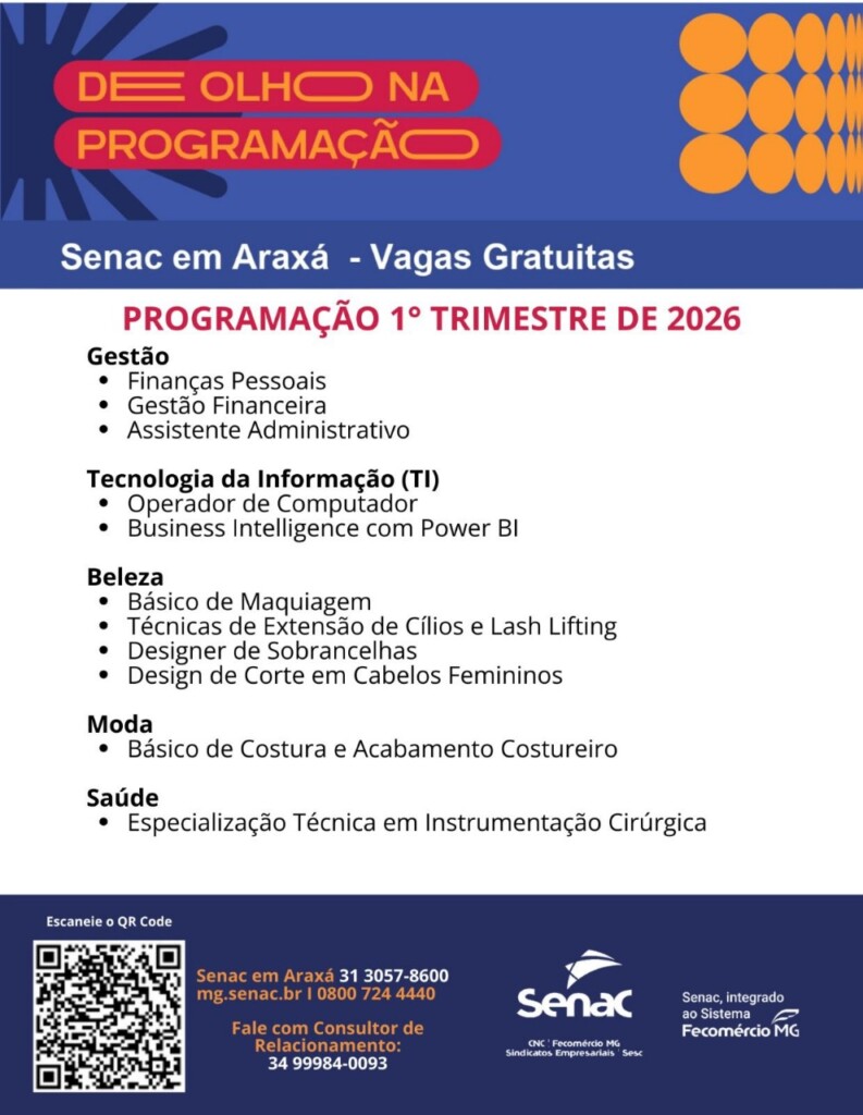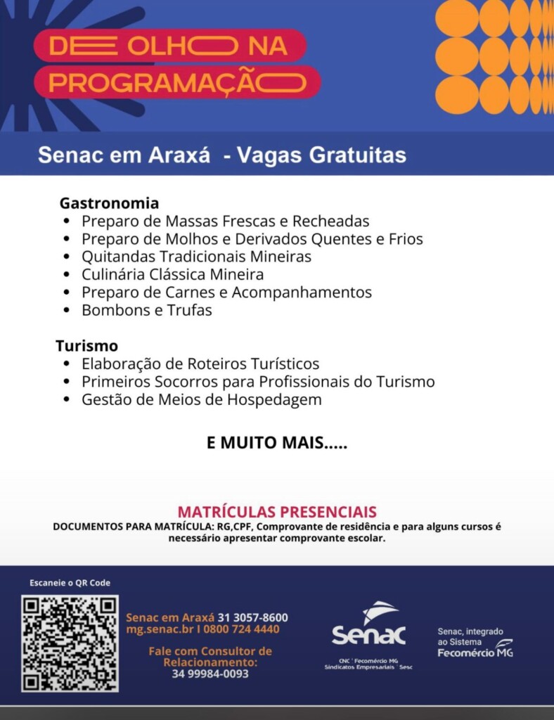 O Senac em Araxá, integrante do Sistema Fecomércio MG, está com inscrições abertas para diversos cursos profissionalizantes gratuitos. São mais de 1400 vagas distribuídas entre qualificações nas áreas de Beleza, Comunicação, Gastronomia, Gestão, Hospedagem, Moda, Produção de Alimentos, Saúde, Segurança, Tecnologia da Informação e Turismo. As oportunidades são oferecidas por meio dos programas Senac+ e Programa Senac de Gratuidade (PSG).