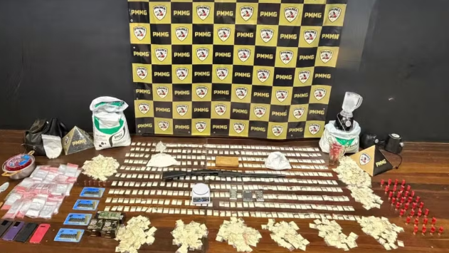 Ao todo, foram apreendidos 1.054 papelotes de cocaína e uma barra de aproximadamente um quilo de pasta base da mesma droga. Também foram recolhidos um rifle calibre 12 e mais de 100 munições dos calibres 12 e 38. Além disso, os policiais encontraram material usado para embalar a droga e um caderno com anotações.