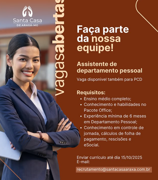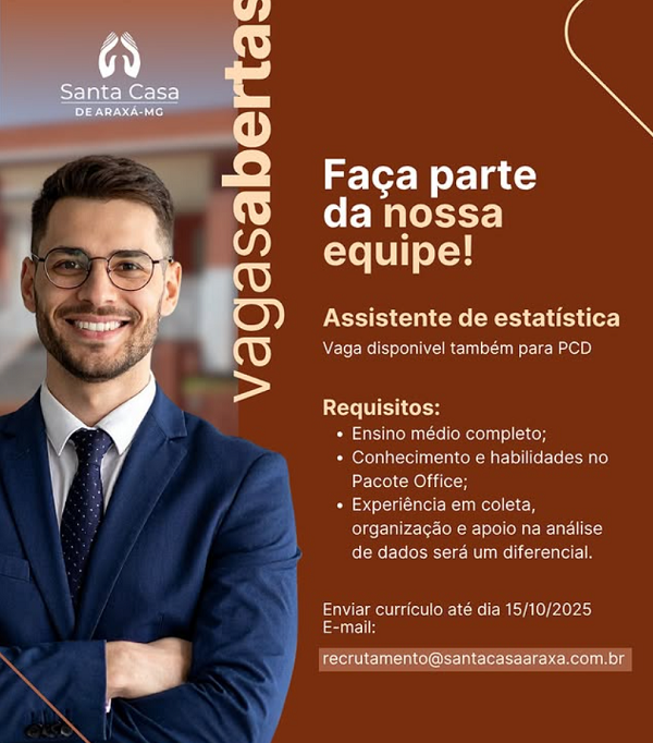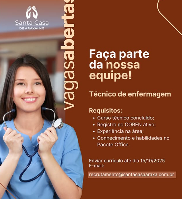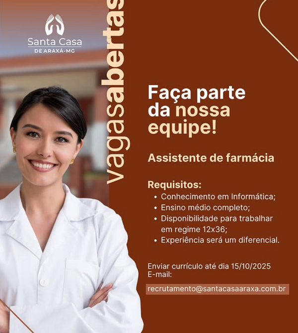 A Santa Casa de Misericórdia de Araxá está com inscrições abertas para preenchimento de vagas em áreas cruciais de sua operação, oferecendo oportunidades para profissionais qualificados na área da saúde e administrativa. Os interessados devem enviar seus currículos até a próxima quarta-feira, dia 15 de outubro para o e-mail [email protected].