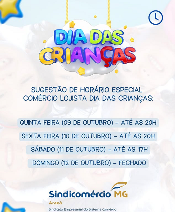 O Sindicomércio Araxá propôs um horário especial de funcionamento para o comércio lojista da cidade em alusão ao Dia das Crianças, celebrado em 12 de outubro. A sugestão visa impulsionar as vendas e oferecer mais comodidade aos consumidores que buscam presentes para a data comemorativa.