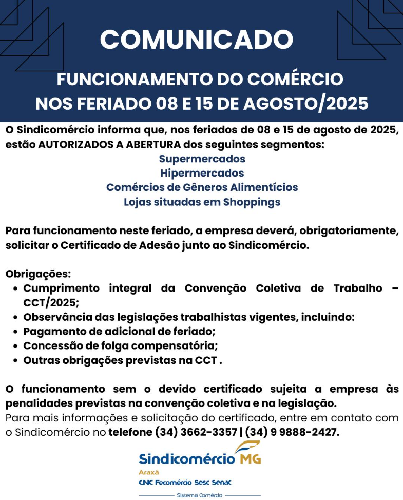 O SindiComércio Araxá divulgou um comunicado importante sobre o funcionamento do comércio durante os feriados dos dias 8 e 15 de agosto de 2025. No dia 8, celebra-se o Dia de São Domingos de Gusmão, padroeiro da cidade, e no dia 15 ocorre a festa de Nossa Senhora da Abadia, uma data significativa para a comunidade local.