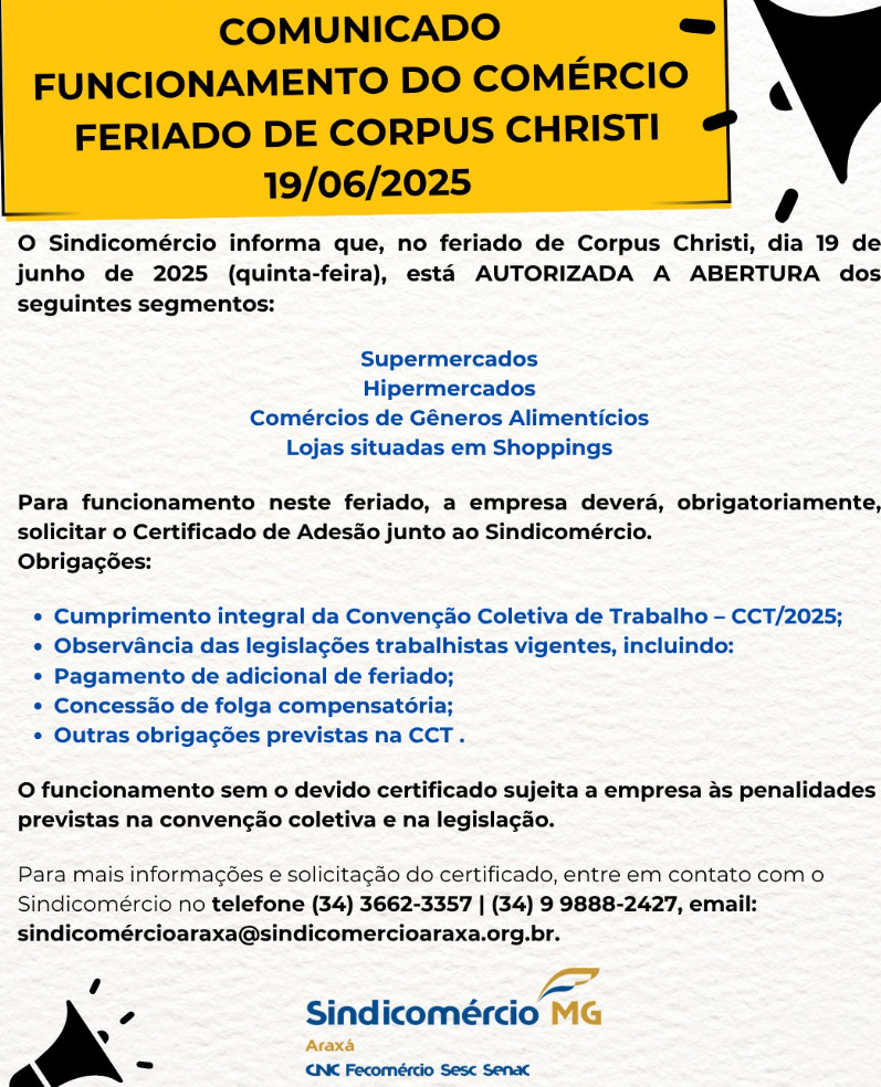 Em comunicado, Sindicomércio Araxá informa que estão autorizadas a funcionar no feriado de Corpus Christi, celebrado amanhã, quinta-feira, dia 19 de junho, os seguintes segmentos comerciais. supermercados, hipermercados, comércios de gêneros alimentícios e lojas localizadas em shoppings.