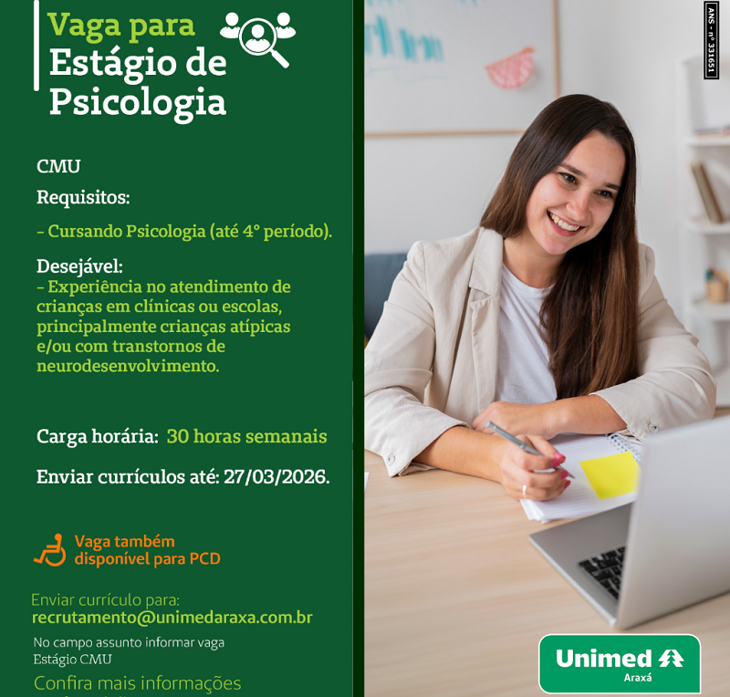 A Unimed Araxá está com uma oportunidade de estágio para estudantes de Psicologia. Os interessados devem enviar os currículos até amanhã, sexta-feira, 27 de março, para o e-mail: recrutamento@unimediaraxá.com.br. Não perca essa chance de fazer a diferença na vida de crianças!